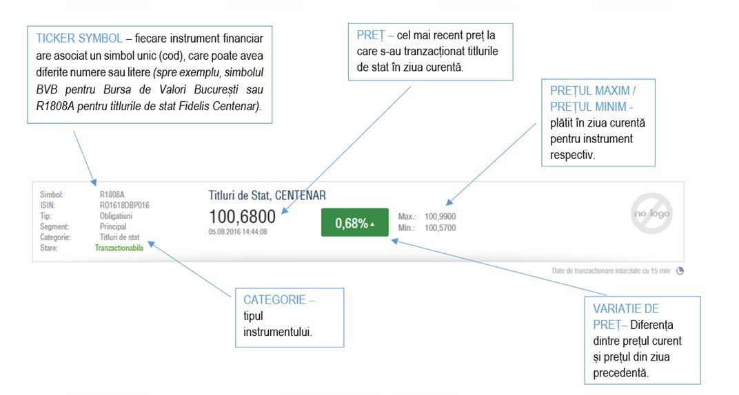 - Pretul unui titlu de stat este stabilit prin sistemul Bursei de Valori Bucuresti, in baza cererii si ofertei, fiind dependent de conditiile pietei. Pretul este exprimat ca procent din valoarea nominala si poate fi mai mare sau mai mic decat valoarea initiala de 100%, echivalent valorii nominale de 100 de lei. Pentru simbolul R1808A, in situatia in care un investitor tranzactioneaza pe 5 august 2016 la un pret de 100,2 %, iar volumul este 10, valoarea tranzactiei se determina pe baza acestui pret la care se adauga dobanda acumulata de la inceputul perioadei de cupon pana la data decontarii tranzactiei – 9 august 2016 - stabilita la 2 zile lucratoare fata de data tranzactiei si a volumului ordinului respectiv.