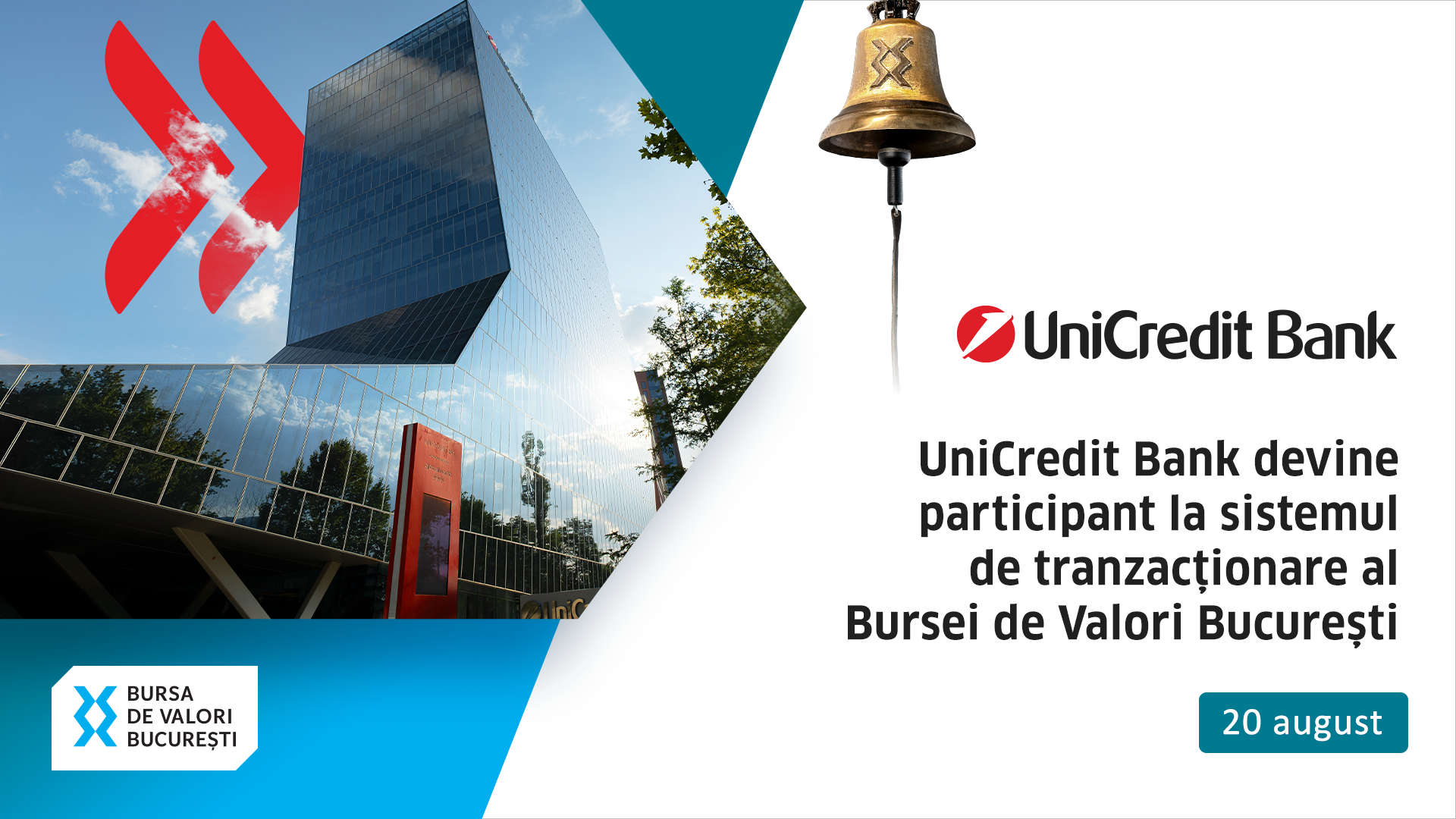 Bursa de Valori Bucuresti si UniCredit Bank, parte a Grupului UniCredit si una dintre principalele institutii financiare din Romania, va invita sa urmariti miercuri, 20 august, de la ora 10:00, evenimentul care marcheaza debutul UniCredit Bank ca participant la sistemul de tranzactionare al Bursei de Valori Bucuresti. Incepand cu 15 august, UniCredit Bank va prelua de la Alpha Bank serviciile de investitii financiare privind tranzactionarea pe piata de capital.