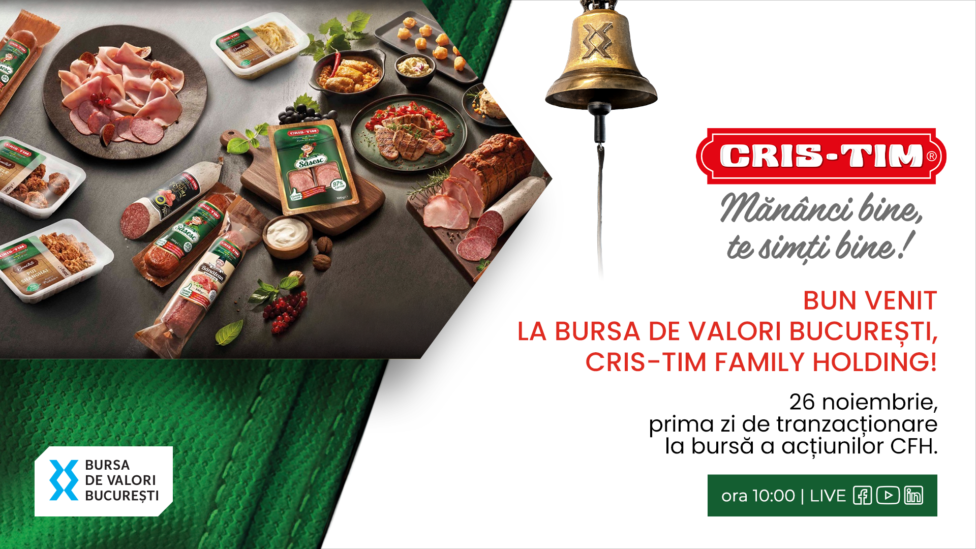 Bursa de Valori Bucuresti (BVB) si Cris-Tim Family Holding, liderul pietelor de mezeluri si de ready-meals din Romania, va invita sa urmariti miercuri, 26 noiembrie, listarea pe Piata Reglementata a Bursei a actiunilor CFH.