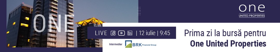 Bursa de Valori Bucuresti (BVB) va invita luni, 12 iulie, la deschiderea sedintei bursiere cu ocazia listarii One United Properties pe Piata Principala a bursei. Evenimentul va avea loc in data de 12 iulie, incepand cu ora 09:45 si va putea fi urmarit LIVE pe canalele de social media ale Bursei de Valori Bucuresti (Facebook, YouTube si LinkedIn).