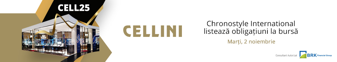 Prima emisiune de obligatiuni Cellini, cea mai veche retea de magazine de bijuterii si ceasuri din Romania, a debutat astazi la Bursa de Valori Bucuresti. Chronostyle International, compania care opereaza magazinele Cellini, a atras prin emisiunea de obligatiuni CELL25 fondurile necesare extinderii retelei de magazine proprii si cresterea vanzarilor on-line.
