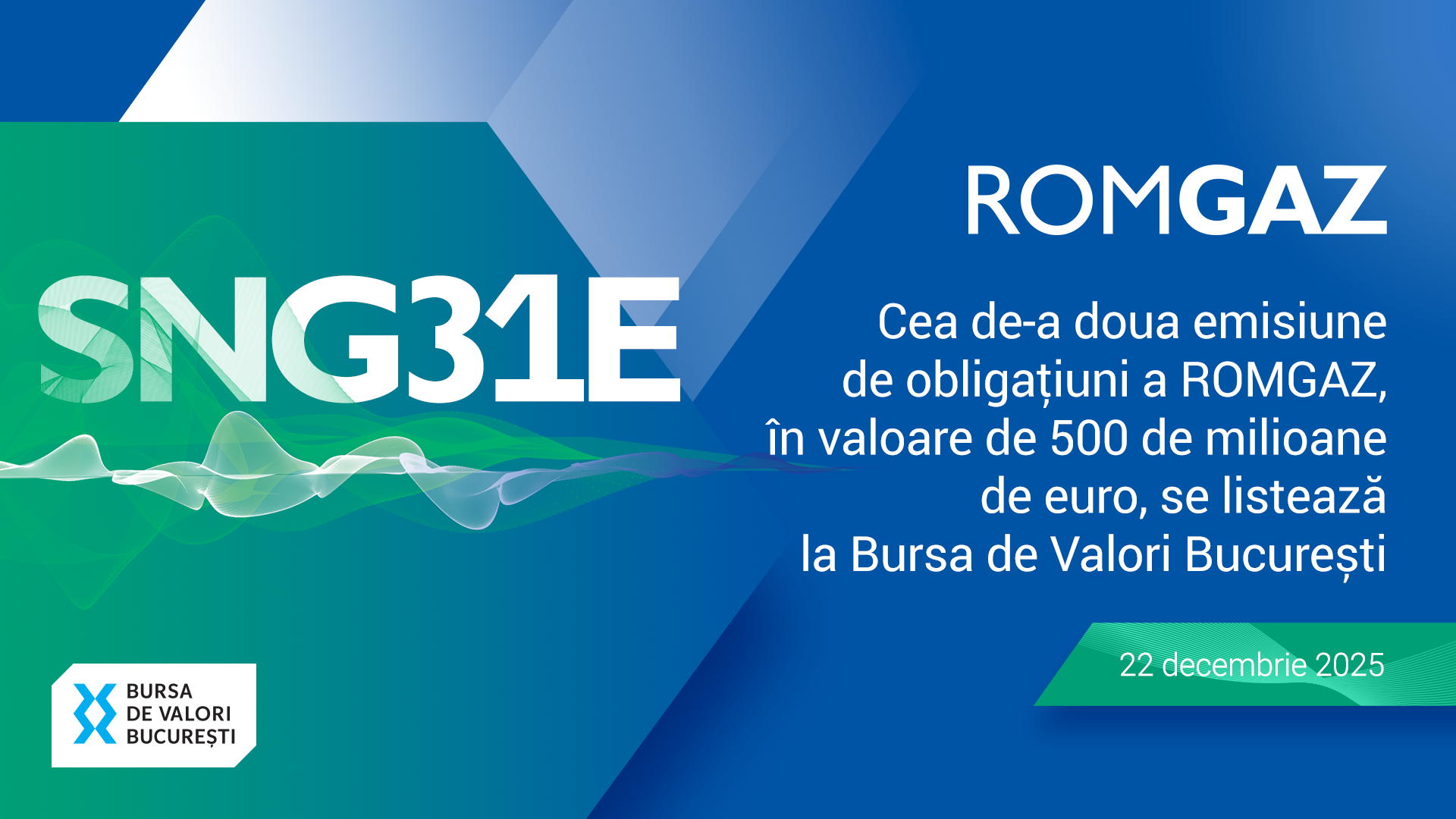 Bursa de Valori Bucuresti (BVB) si Societatea Nationala de Gaze Naturale ROMGAZ S.A (simbol bursier SNG), cel mai mare producator si principalul furnizor de gaze naturale din Romania, va invita sa urmariti luni, 22 decembrie, evenimentul care marcheaza listarea pe Piata Reglementata a Bursei a celei de-a doua emisiuni de obligatiuni a ROMGAZ.