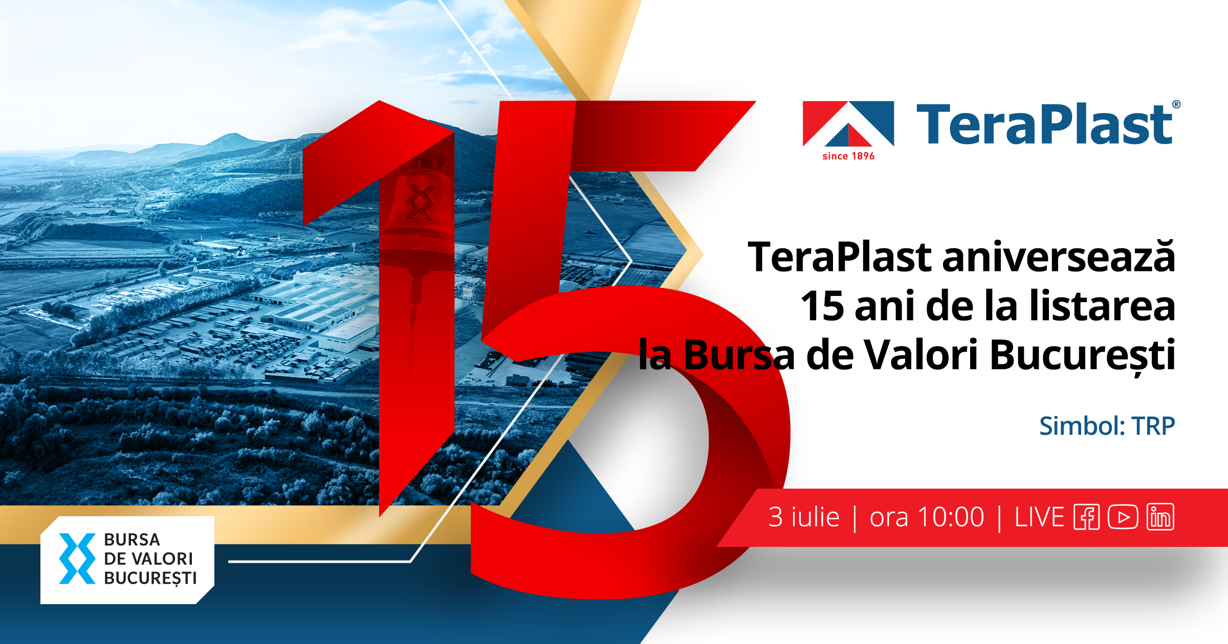Bursa de Valori Bucuresti va invita luni, 3 iulie, sa urmariti deschiderea oficiala a sedintei de tranzactionare dedicata aniversarii a 15 ani de la listarea TeraPlast pe Piata Reglementata a bursei locale. Cu aceasta ocazie, reprezentantii TeraPlast vor suna clopotelul BVB pentru a marca o noua etapa importanta in evolutia companiei la Bursa de Valori Bucuresti.