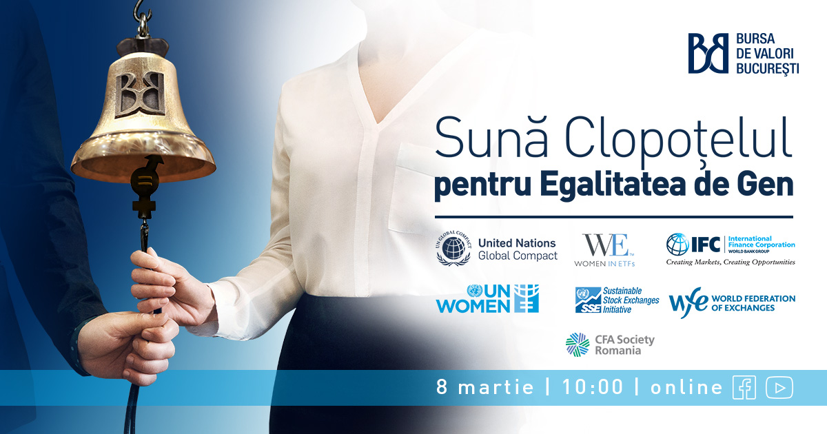 In acest an, clopotelul BVB va suna virtual pentru Egalitatea de Gen, la Bursa de Valori Bucuresti, iar evenimentul va fi organizat in forma unei discutii online, care va fi transmisa pe: