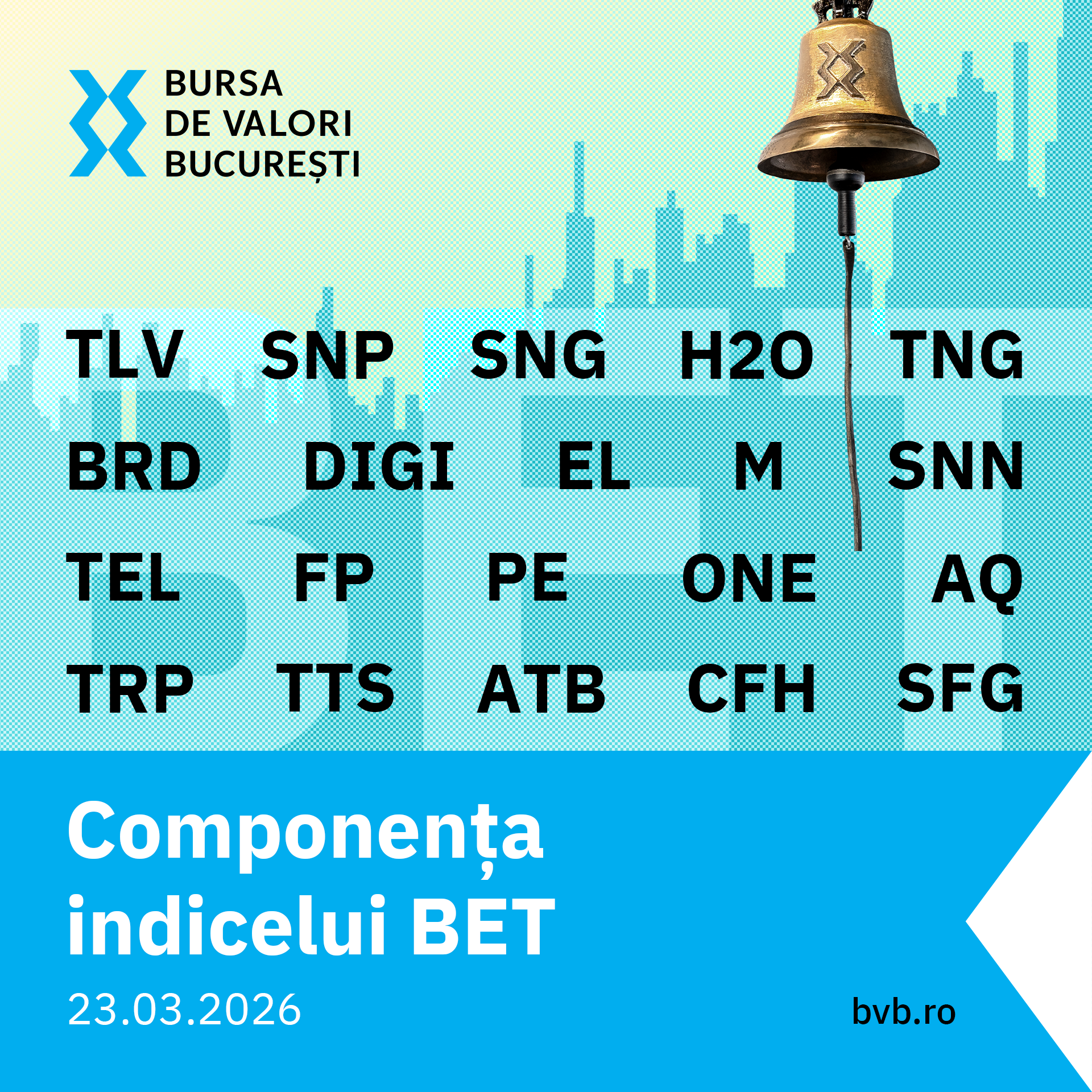 BET (Bucharest Exchange Trading index) este primul indice dezvoltat de BVB si include cele mai lichide companii de dimensiune semnificativa listate pe Piata Reglementata a Bursei de Valori Bucuresti. Indicele BET este disponibil si in variantele de randament total brut, BET-TR, si randament total net, BET-TRN, care refleca atat performanta de pret, cat si performanta data de reinvestirea dividendelor oferite de companiile din componenta indicelui principal al BVB. Lansat pe 19 septembrie 1997, indicele BET a avut in componenta sa un numar maxim de 10 companii timp de aproape doua decenii. In martie 2022 componenta indicelui a ajuns, pentru prima data, la numarul maxim de 20 de companii, ca rezultat al unui proces gradual de extindere. Cele mai recente modificari in componenta indicelui BET au avut loc in septembrie 2024, odata cu includerea actiunilor companiilor Antibiotice si Premier Energy.