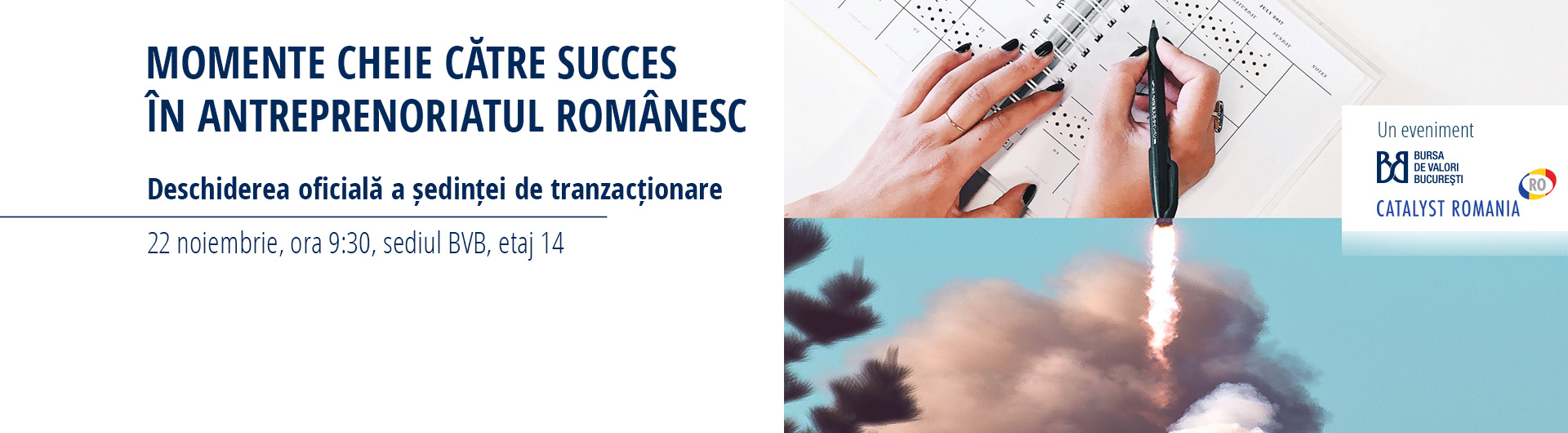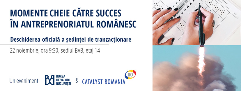 Bursa de Valori Bucuresti (BVB) si Catalyst Romania va invita miercuri, 22 noiembrie, la o discutie despre antreprenoriatul românesc si momentele cheie din viata companiilor în drumul lor spre succes. Care au fost aceste puncte de cotitura si ce decizii au luat în situatii limita trei antreprenori români, aflati miercuri alaturi de Marius Ghenea (Catalyst Romania), Lucian Anghel (BVB), Dan Vidrascu (Elefant.ro), Mircea Capatina (SmartBill) si Daniel Truica (Vola.ro).