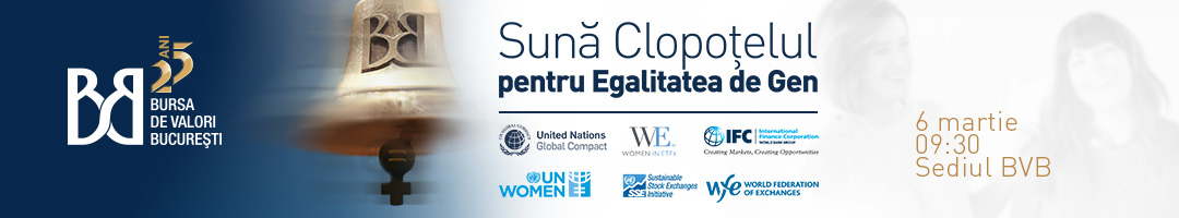 Banca Mondiala, IFC, UN si Bursa de Valori Bucuresti (BVB) va invita in data de 6 martie la un eveniment special organizat cu ocazia Zilei Internationale a Femeii, pentru Egalitatea de Gen. Va invitam sa sunam clopotelul pentru Egalitatea de Gen, la Bursa de Valori Bucuresti.