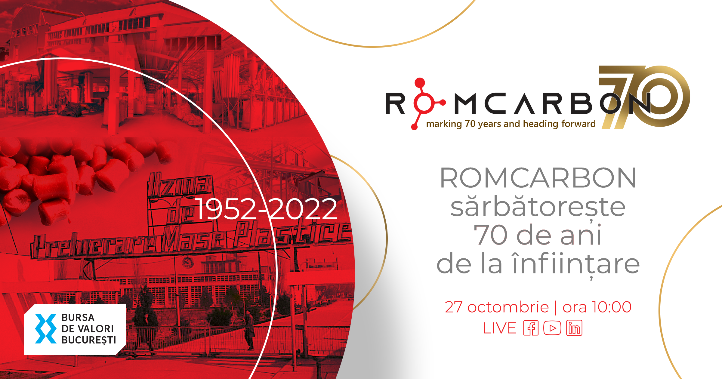 Bursa de Valori Bucuresti (BVB) va invita joi, 27 octombrie, la deschiderea oficiala a sedintei bursiere dedicata aniversarii a 70 de ani de la infiintarea Romcarbon. Cu aceasta ocazie, echipa Romcarbon va suna clopotelul BVB. Pe data de 27 februarie a acestui an, Romcarbon a aniversat 25 de ani de la listarea la BVB, sub simbol bursier ROCE.
